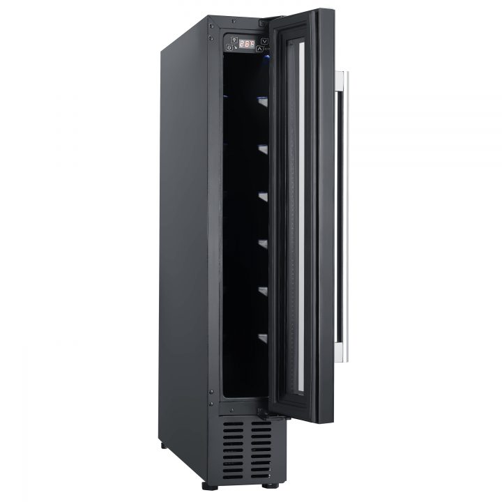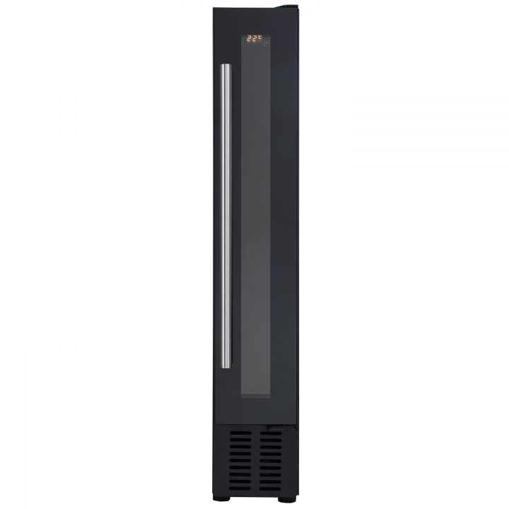 If you want to add a touch of class to your kitchen, this 15cm wine cooler won’t take up a lot of space and will even fit under your kitchen worktop! The single stacked shelves cater for up to 7 bottles, you’ll always have a few bottles ready for guests and you can even fit a bottle of champagne at the bottom for special occasions. The red LED display compliments the sleek black glass design and the internal LED light is bright and efficient and will bounce off your bottles, adding heaps of style to your kitchen and the door glass is UV resistant to protect your wine. The door can be reversed so you have a choice of whether the wine cooler door opens left or right. This wine cooler uses a compressor like a fridge, allowing you to get proper chilled wine. The downside with compressor driven wine coolers can be the noise level, however this model has a noise level of only 41dB – whisper quiet!