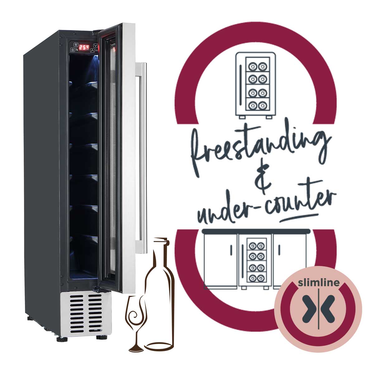 This wine cooler can be freestanding, or you can keep it under your kitchen counter. A slimline design to fit in a small spare space of your home.