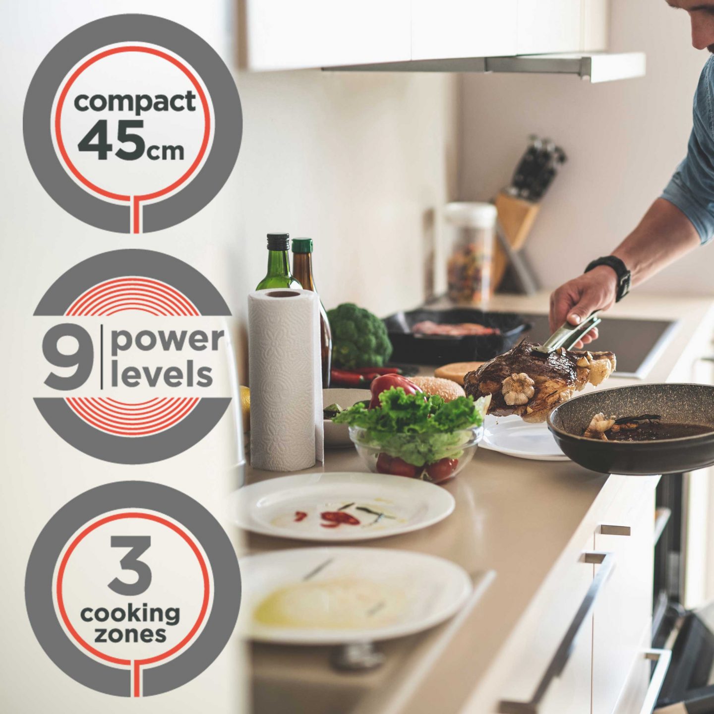 Cookology 45cm Ceramic Hob, a little different from the rest! This 3 Burner Ceramic Hob is great for your compact kitchen design, or installing inside your converted van. Each cooking zone works up to 9 power levels and has residual heat indicators which warn you the cooking zones are hot. The smooth glass surface is easy to clean and great for keeping your kitchen sparking for a long duration of time. Even though this cooking hob has one less cooking zone, it comes with 3 zones all different sizes to expand the opportunity of cooking in your home.
