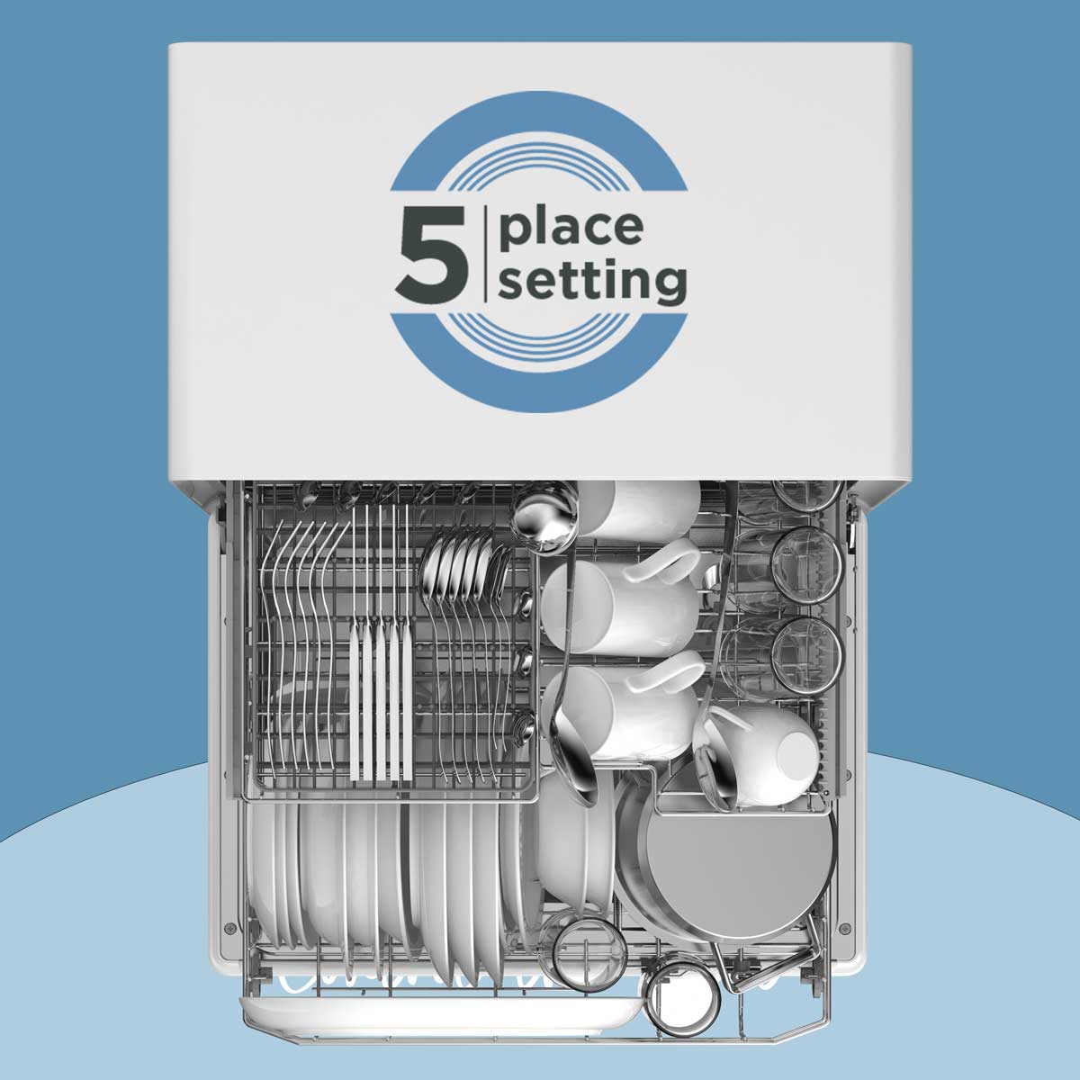 Inside is designed to fit up to 5 place settings, but keeping the size of the dishwasher at 50% less in size. Magic right?